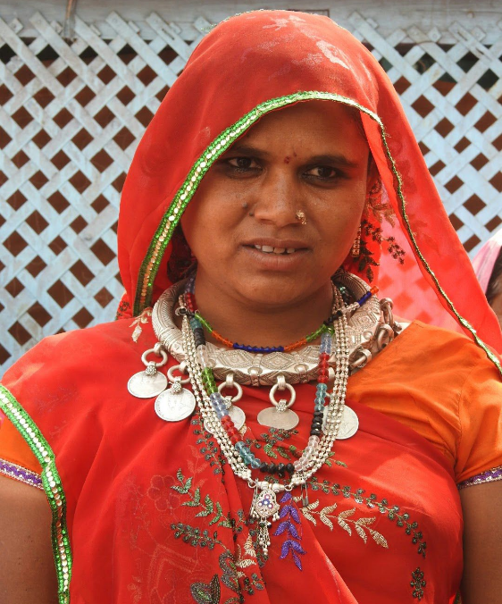 Traditional attire with colorful headscarf and distinctive jewelry of Kutchi women in Gujarat.